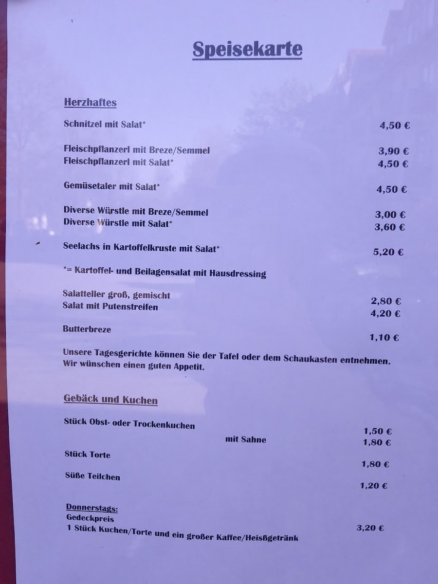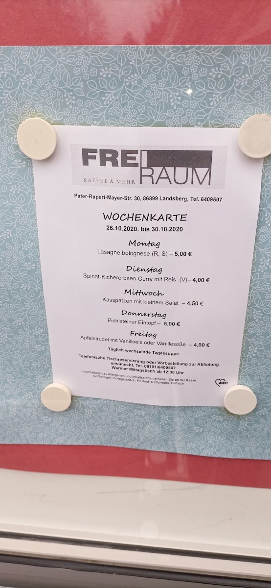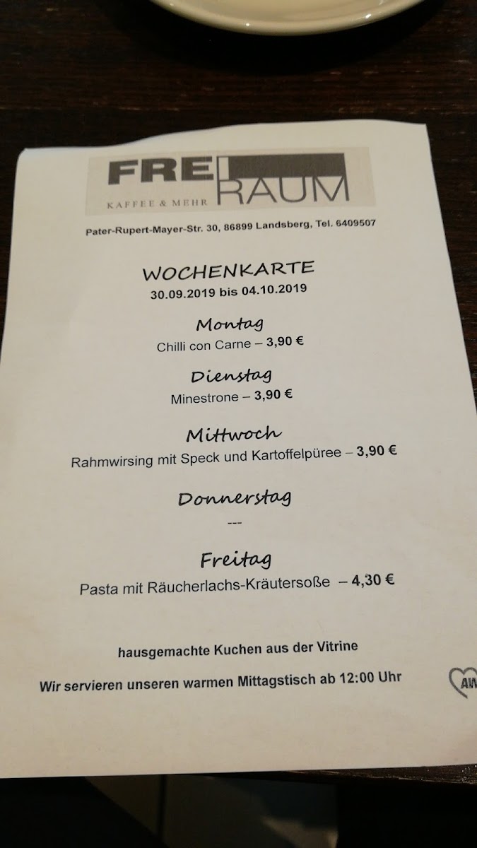 The menu at Café Freiraum offers a selection of coffee and other beverages alongside light food options, suitable for various times of the day including breakfast, coffee breaks, and light meals. Visitors can expect standard café drinks such as espresso, cappuccino, and other coffee specialties, as well as a limited range of snacks and simple meals.