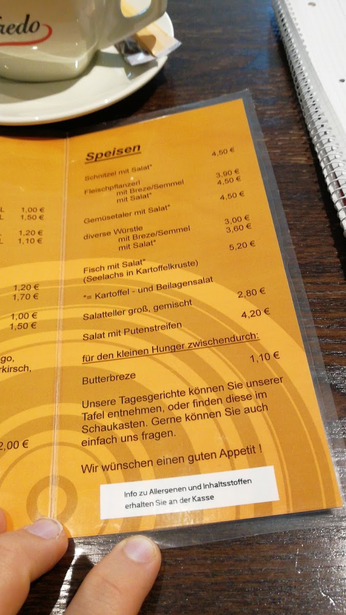 Guests can typically use the menu for a quick coffee break or a light meal in a casual environment, with the food and drinks offered reflecting basic café and coffee shop offerings common to the area.